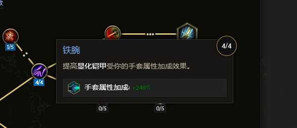 因为盾牌投掷触发的这个横扫技能是范围比较小的一个aoe技能,可通过铁腕这个节点,把手套的范围加成技能放大来提升显化盔甲的清图效率。