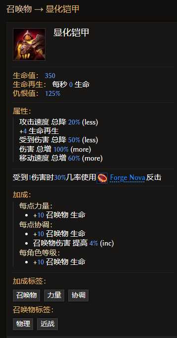 因为显化盔甲享受人物武器的全部加成,因此这把武器成为它的标配,大量点伤、暴击伤害和物理穿透,尤其是带双穿抗的词缀,显化盔甲都能享受。对于缺基础点伤的召唤物来说,享受武器词缀加成,提升巨大。