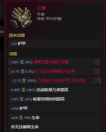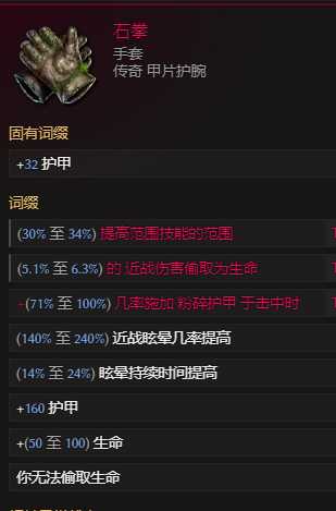 手套:石拳,世界掉落。眩晕词缀优先高roll 合成词缀如下 优先保证范围词缀,其他的都能在别的地方找,晕boss很香,负面作用对小宝无效。