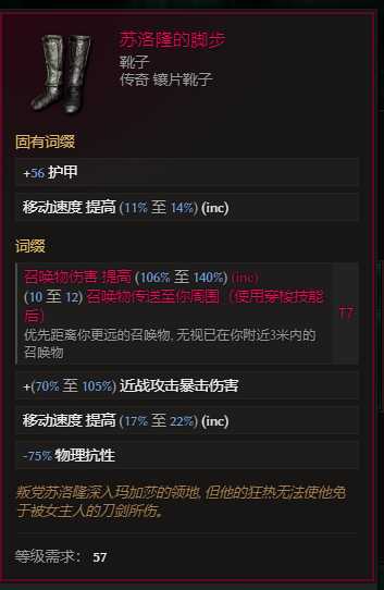 靴子:苏洛隆的脚步 世界掉落 合成个召唤伤害即可 提供大量 近战暴击伤害,该属性roll越高越好,其次移动速度词缀