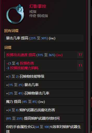 戒指:幻影掌控1个,世界掉落 选+3%以上召唤物暴击率 +2技能以上的。合成词缀如下,投掷速度必备 -3魔耗可以变成生命等,但是另一个戒指得有1个-3魔耗