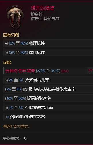 护身符:洛吉的渴望。合成词缀召唤生命%。90火灵专属掉落 选+3召唤暴击率的 帮助宠物满暴击
