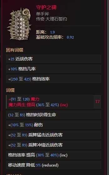 武器:守护之碑 世界掉落 合成词缀碎甲 魔力再生 近战偷取生命 自行取舍