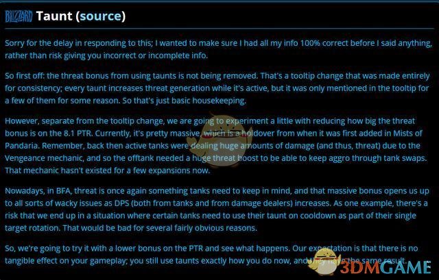 所以我们打算现在测试服务器上降低仇恨值,然后观察一下可能发生的情况。我们的目的是希望不会影响到玩家的游戏体验,你仍然可以像现在一样使用嘲讽,不会带来明显的影响。