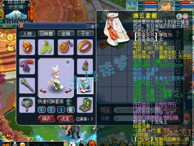 70级简易水清诀机关鸟套女衣,人造装备可以熔炼,熔炼后防御达到了140,打了7锻光芒石。