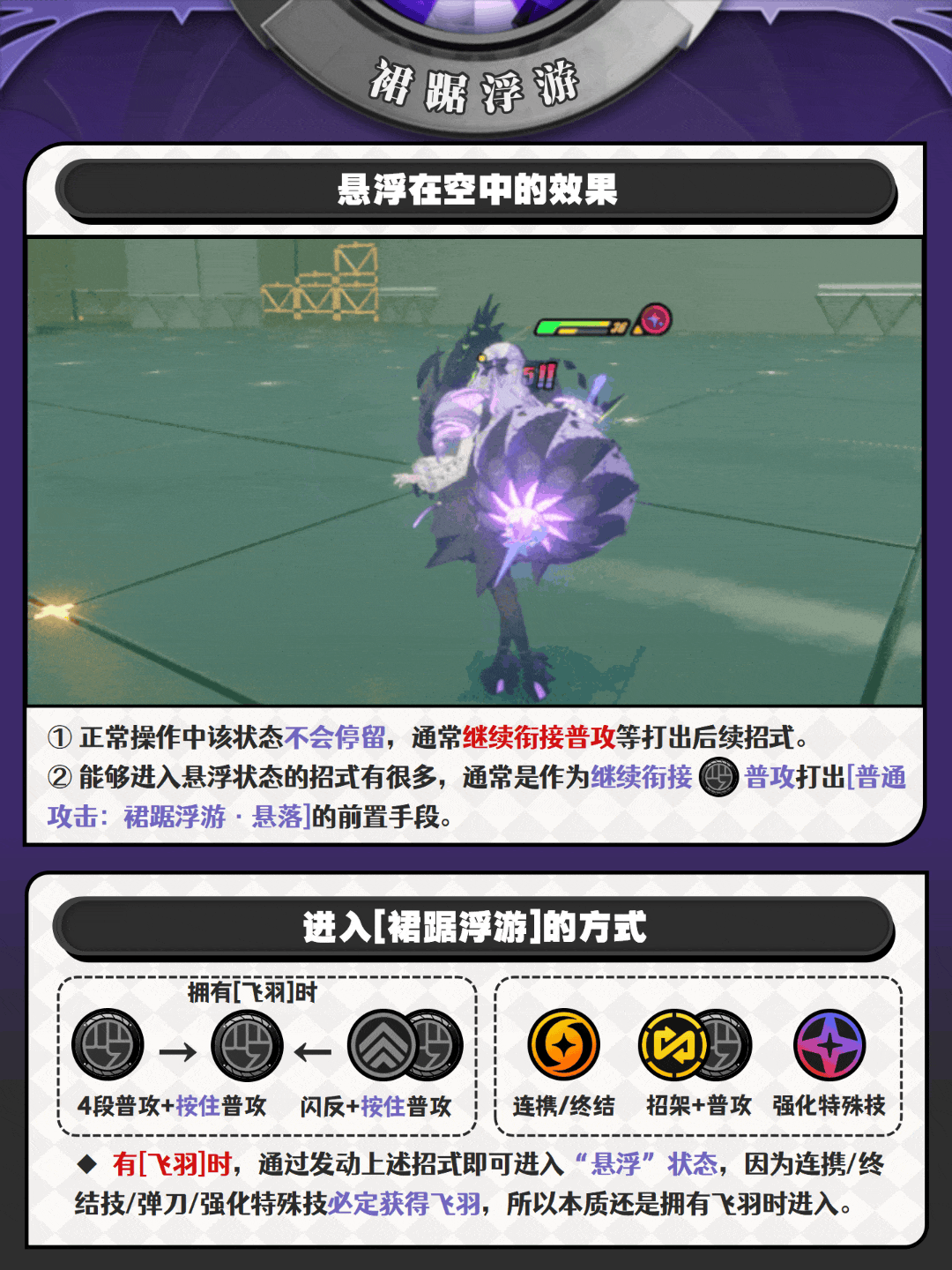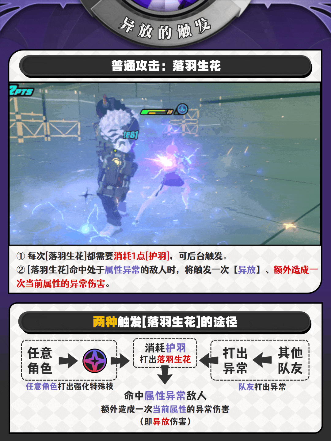 *每次消耗护羽可打出落羽生花,命中异常敌人可造成异放伤害。