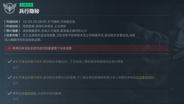 3、在长弓溪谷任意战区行动中,前往哈夫克雷达站,于主楼二楼左侧自助咖啡机旁沙发上拾取任务物品化学废物资料。