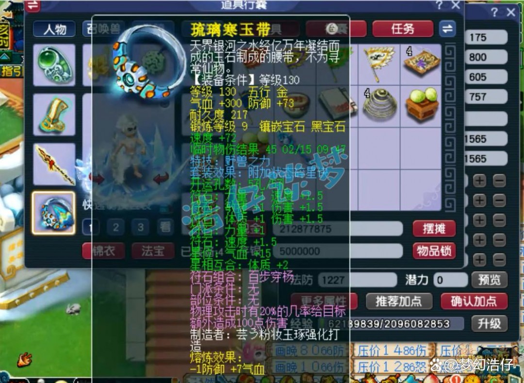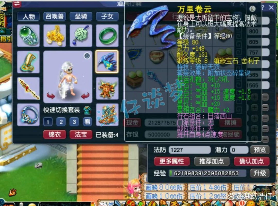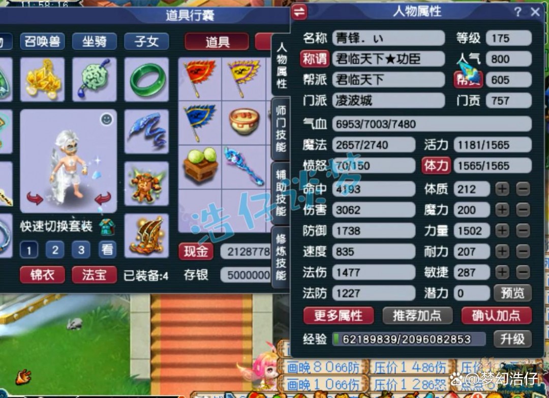 175级凌波城打符之后的面板属性,3062的伤害刷任务完全足够了,而且凌波城面板伤害并不是太重要,主要靠战意打伤害!