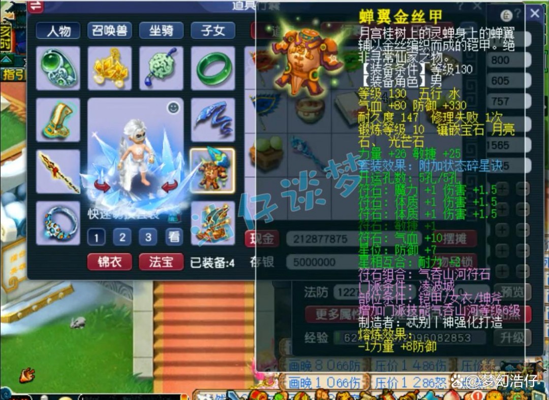 130级碎星诀套铠甲,熔炼后力敏双加50,打了8锻月亮石、2锻光芒石。