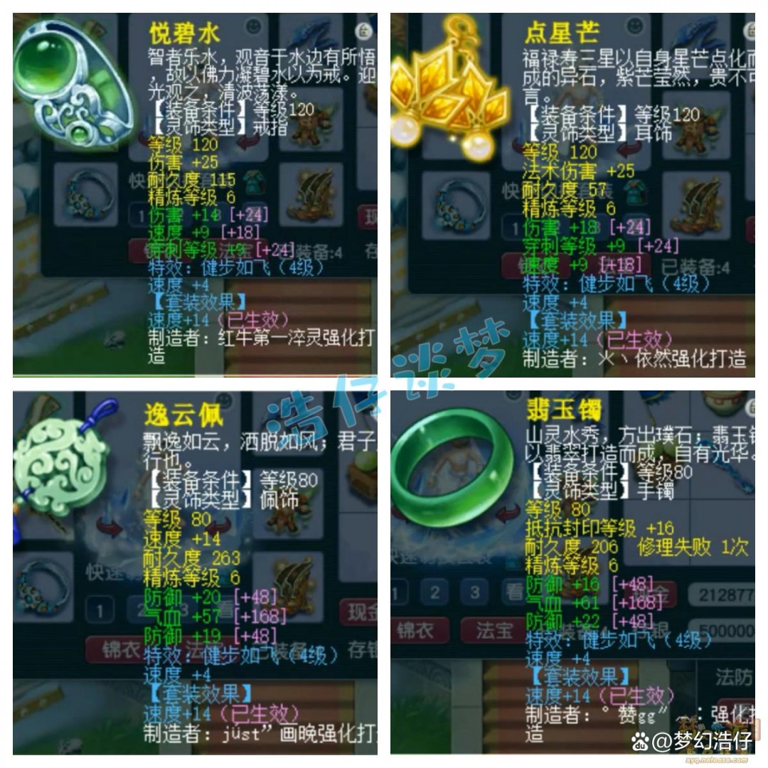 戒指和耳饰下排都是伤害速度穿刺,配饰和手镯下排都是双防御一气血,全部打了6锻星辉石,特效都是4级健步如飞。