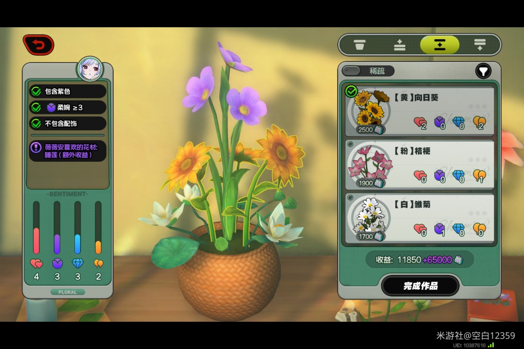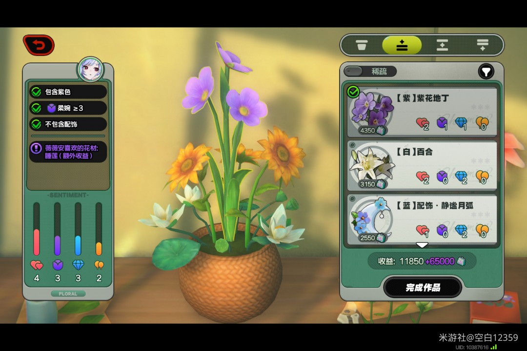 任意花盆,【紫】紫花地丁,【黄】向日葵,【白】睡莲
