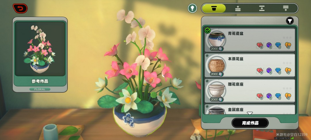 青花花盆,【白】蝴蝶兰,【粉】桔梗(稠密),【白】睡莲(稠密)