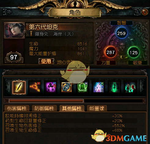 8500血78%攻击格挡,3元素抗性上限 80,79,79 召唤伤害 552%