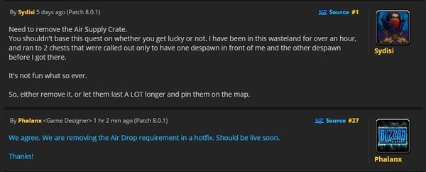 美服玩家Sydisi在论坛中提出,战争召唤任务中开启空投箱的要求不合理,因为这过于随机性,使得运气好的玩家很容易就能做完,而各位“非酋”可能半天都等不来一个箱子。暴雪在今天进行了回应,表示将会通过在线修正将这个要求去掉,使得任务不再“看脸”。