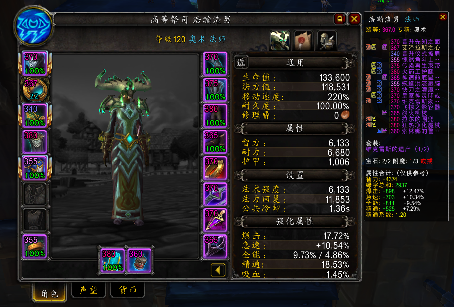 奥法作为一个布甲职业,在高层大秘境里有天生的劣势,比如没有自疗,护甲低等等。所以我个人会把更多的属性分配给全能,获得更多的硬减伤(虽然最多也就5%)。