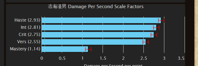 先上一张我当前装备的SIMC属性权值模拟,咱们再来讨论一下应该怎么分配8.0初期那点可怜的绿字。