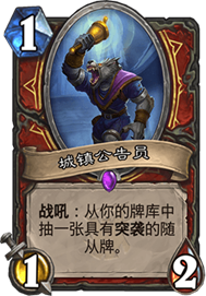 这套牌里塞了足足五张突袭小弟,其中“城镇公告员”简直是良心打工仔,不仅能稳定检索关键牌,一费还能提供一个1/2的肉盾,用来前期站场简直不要太舒服!
