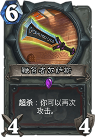 “鞭笞者苏萨斯”,还记得当年那把控场神器“愚者之灾”吗?这把刀也能起到类似的效果!更重要的是,它还能砍脸!对付没回血的职业,四回合16点伤害,直接送他归西!中期控场保小弟,也是它的拿手好戏!(PS:超杀就是公鸡大鱼怪的血量,别再问主播什么是超杀了!)