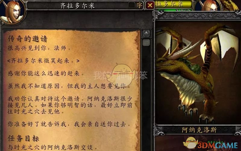 方案二:橙杖持有者的特权 拥有大地的裂变版本橙杖“巨龙之怒,泰蕾苟萨的寄魂杖”的法爷们,你们的春天来了! 在同样的NPC处接任务“传奇的邀请”,然后和NPC对话,直接传送到时光之穴的阿纳克洛斯面前!