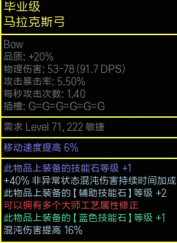 后缀:多大师有2个词缀空余,可以自行补充。因为弓上的后缀没有法术相关的了,我这里选用了16混沌伤害。