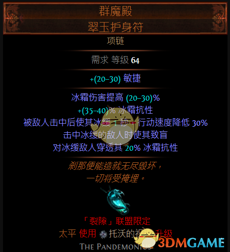 * 提供20%冰穿,致盲效果对于高闪避的欺诈者来说,能提供不错的减伤。后期可以换成塑界黄色项链,附魔20%能量护盾,让你的生存能力更上一层楼!