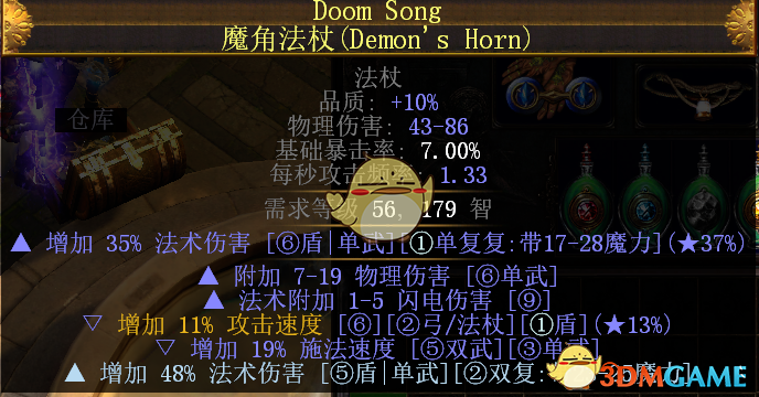 武器:前期双手金装法杖走起,捡到啥法术伤害高的用啥,最好带点施法速度,自己再上一条法术伤害,像这样(虽然我这个等级有点高,但意思到了就行):