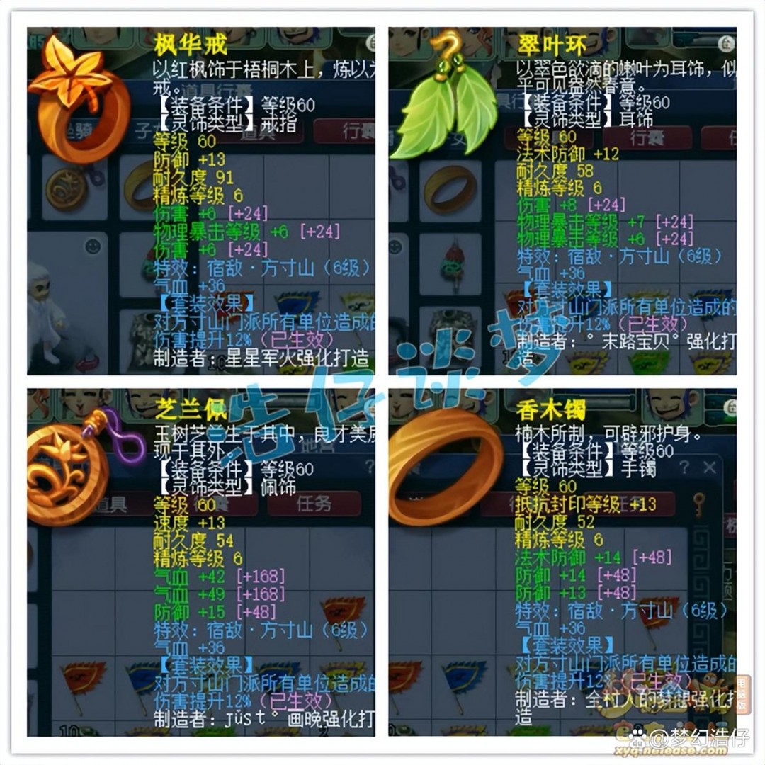戒指下排双伤害一物暴,耳饰下排双物暴一伤害,配饰下排双气血一防御,手镯下排双防御一法防,全部打了6锻星辉石,特效都是6级宿敌方寸山!这一套首饰,简直是壕无人性,把“氪金”两个字写在了脸上!