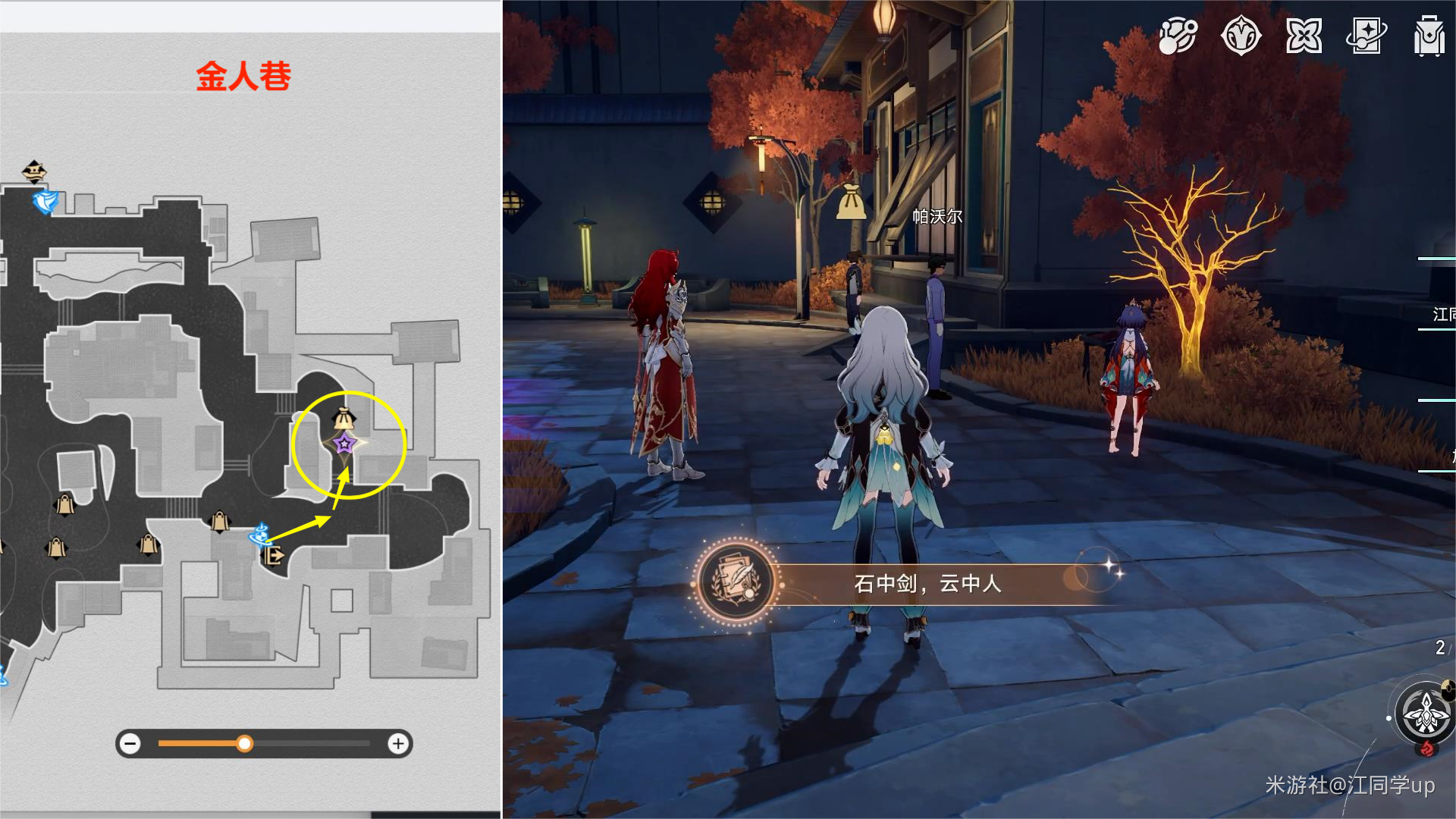 2. 第二站:金人巷,偶遇云璃,开启话痨模式! 跑到金人巷的1号和2号地点,找到云璃,和她进行亲切友好的交流(其实就是听她balabala讲剧情)。