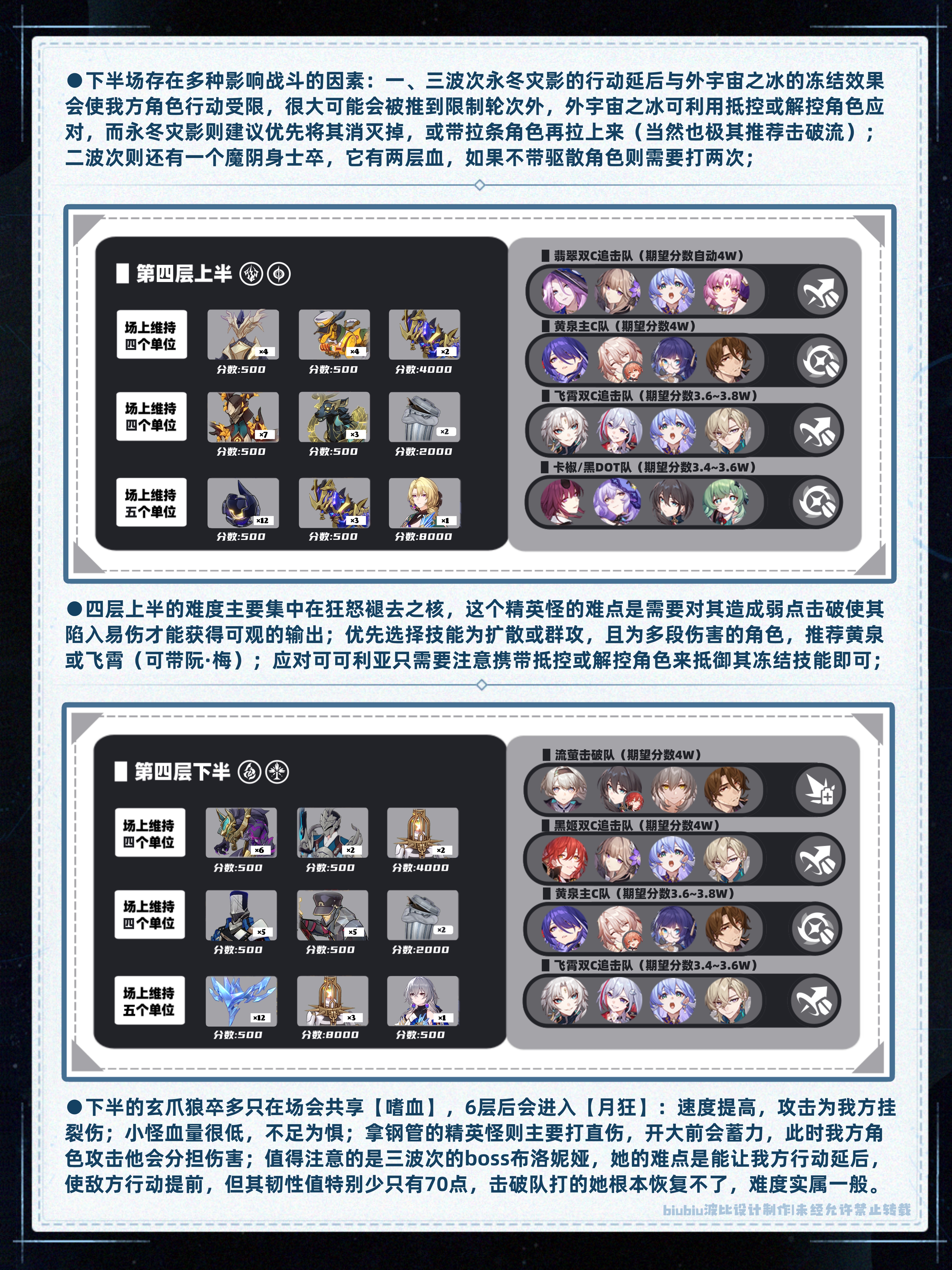 本期较高光的体系是飞霄追击、翡翠追击、黑姬双C追击、黄泉主C(虽很难吃到buff,如果有椒丘,本期上下半均可就业)、流萤单/双C超击破;黑姬本期仍然强势(取3W+的成绩还是很轻松的,四层下半甚至开自动可拿满分,是本期除流萤外第二个容易拿满分的配队);其中受四层上半狂怒褪去之核精英怪影响,银枝队走下半会更易拿得高分;