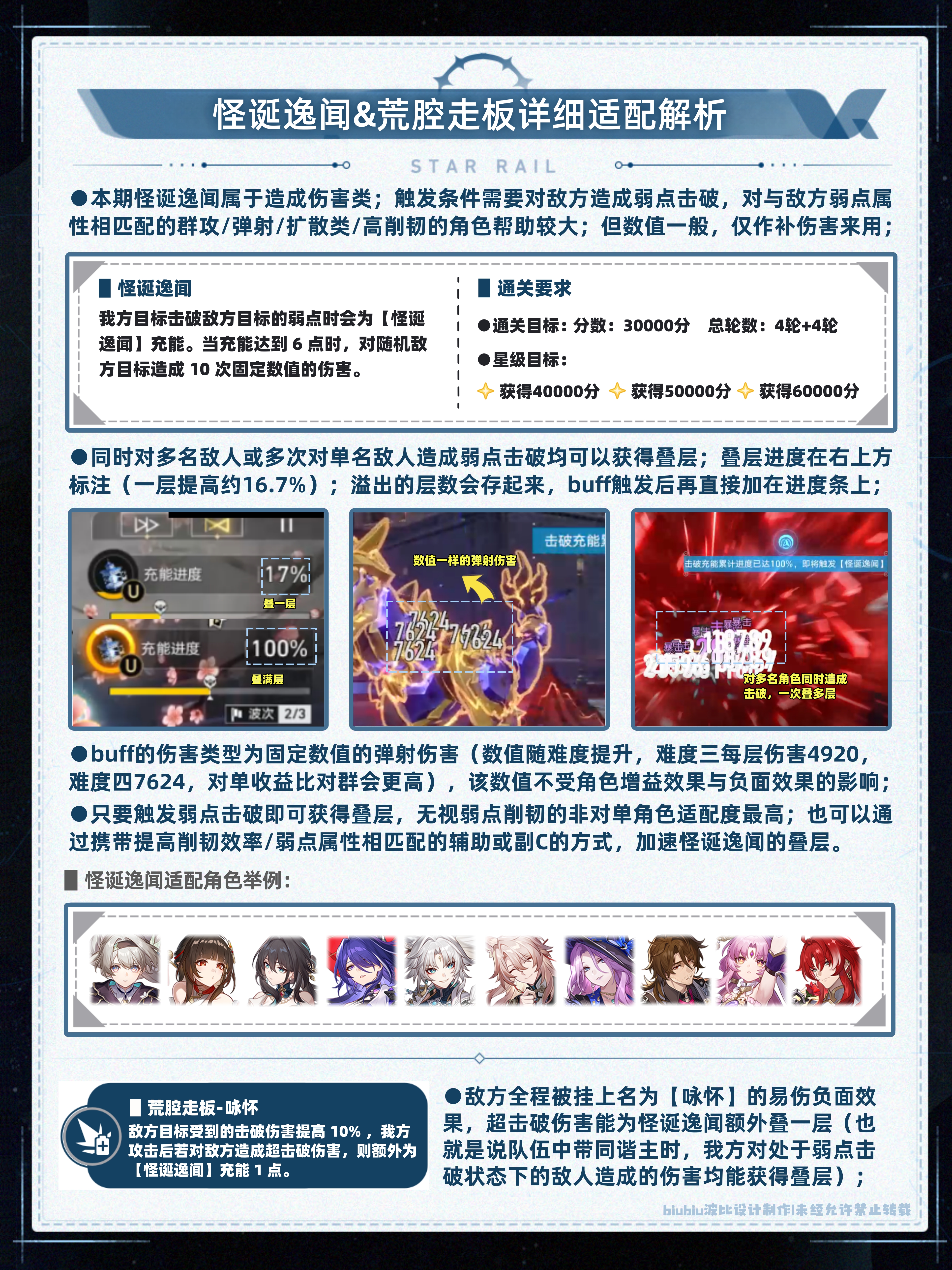 所以帖子中给出的配队基本都是实测后能保证拿满奖励的,这其中不妨会有替换某个角色,体验上会有天差地别的情况发生;(如追击队的砂金:对飞霄大招叠层、知更鸟大招充能、真理医生追击的触发均有一定帮助,因此换下可能会受影响);至于练度上则均按中低配(20+有效词条);