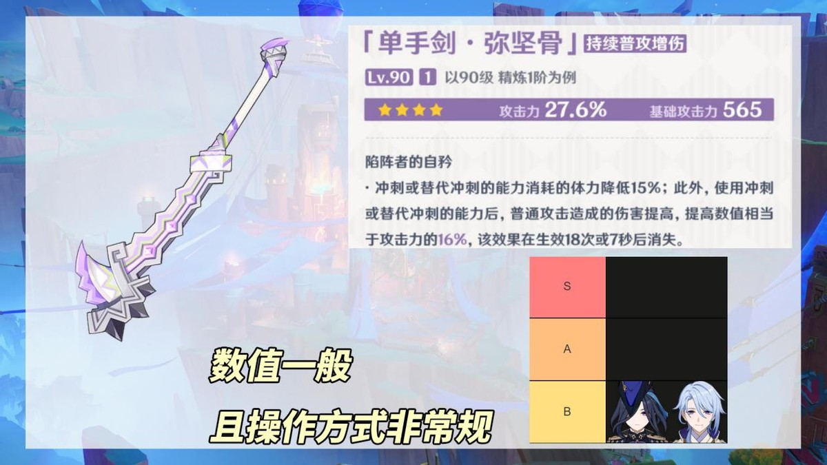简单来说,“弥坚骨”这把剑,拥有高达565的基础攻击力,外加27.6%的攻击力加成,简直就是为了输出而生的!更棒的是,它还能降低你的冲刺体力消耗,让你跑得更快,打得更狠!冲刺之后,普通攻击还能额外提升16%的攻击力(精炼1阶),效果持续18次攻击或者7秒,简直不要太爽!
