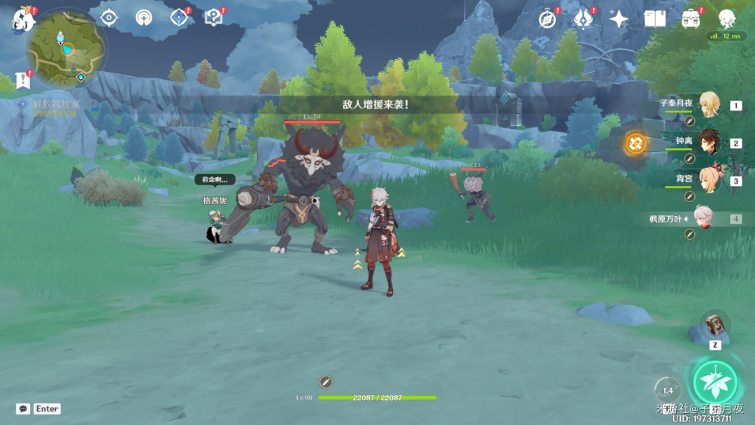 到达指定地点,你会发现有个倒霉蛋被丘丘人围攻了!抄起你的武器,上去就是一顿胖揍,把这两拨丘丘人打得屁滚尿流,成功解救冒险家!