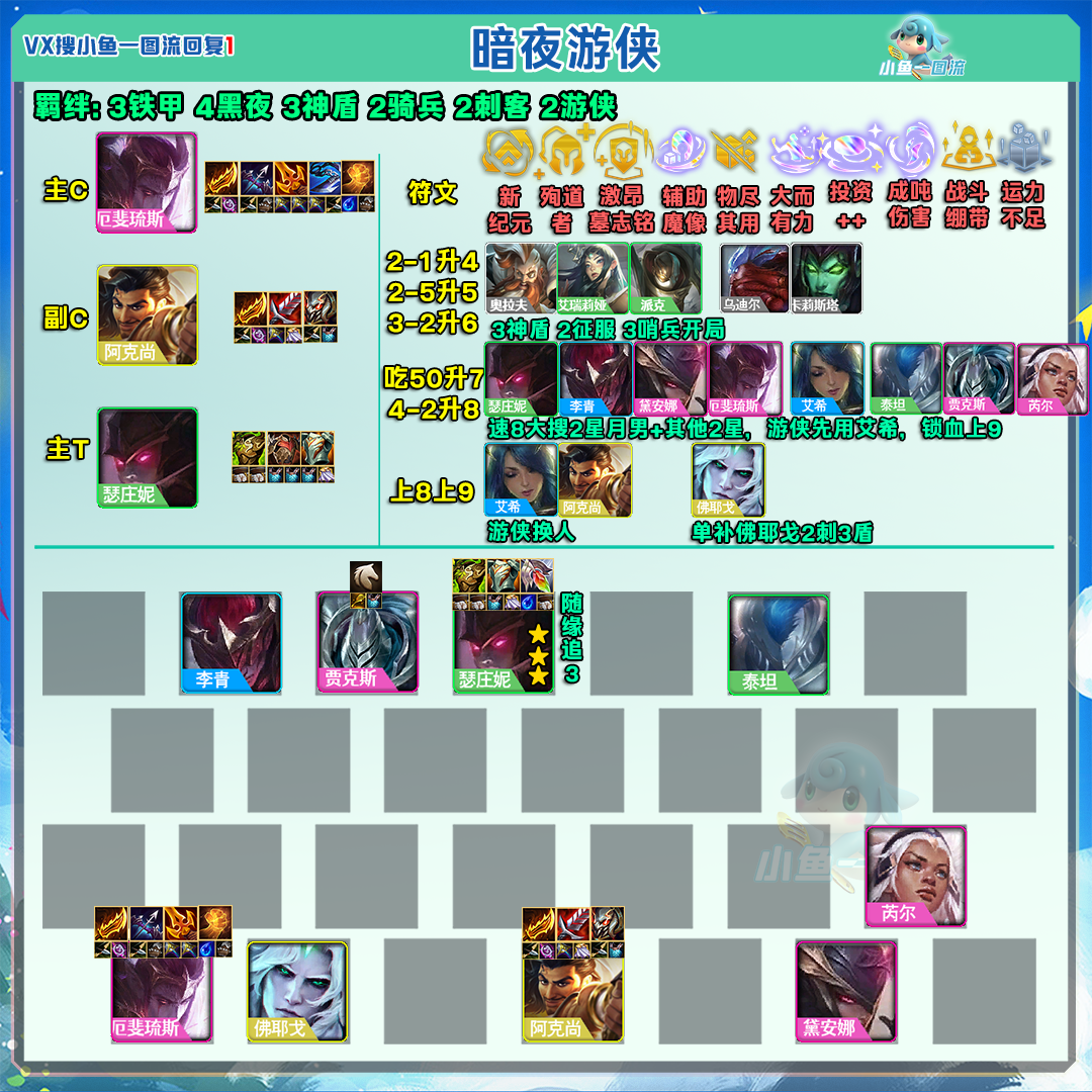 而且,现在符文和羽饰骑士的资源那叫一个泛滥,这套阵容也不一定非得上9。只要你的3星月男站位够风骚,照样能吃鸡!