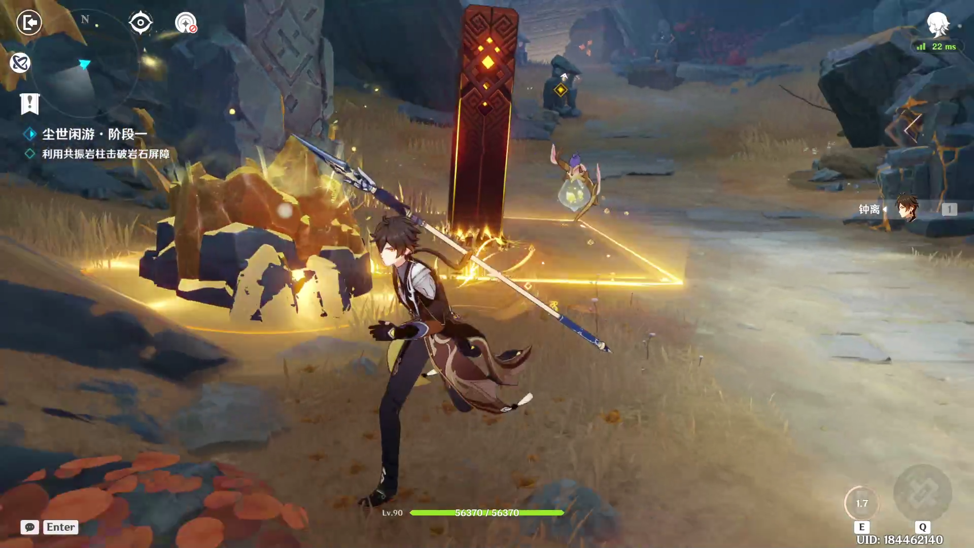 这一阶段的核心就是利用钟离的地星技能(短E),像个地震仪一样,震击共振岩柱,打开通往下一个密室的岩石屏障。记住,这里只需要三次“短E”!