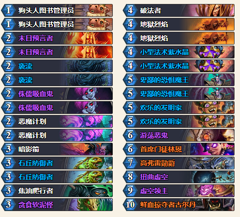 鲜血掠夺者古尔丹:后期牌库中卡牌不多的时候,抽牌的英雄技能也就没用了,这时候我们就需要一个新的英雄技能,那dk就非常的适合我们,不仅可以召唤我们使用过的恶魔直接形成一个非常强大的场面,还能为我们回血,最为重要的是打三点伤害还吸血的英雄技能,对我们后期的抢血,解场以及恢复非常的有帮助。