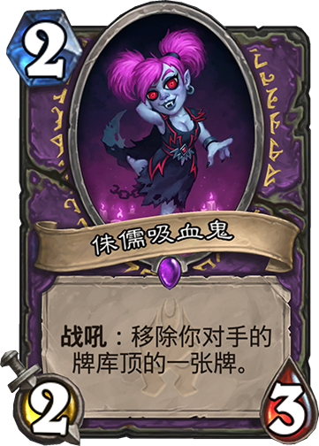 侏儒吸血鬼:二费标准身材,效果却是非常的强大,直接移除掉对手牌库顶上的一张牌,这个效果对于她的身材来说,绝对是非常赚的,而如果我们对上的是一些otk卡组,比如机械克苏恩德之类的牌组,一旦拿掉他们的关键牌,就可以直接导致他们的崩盘。