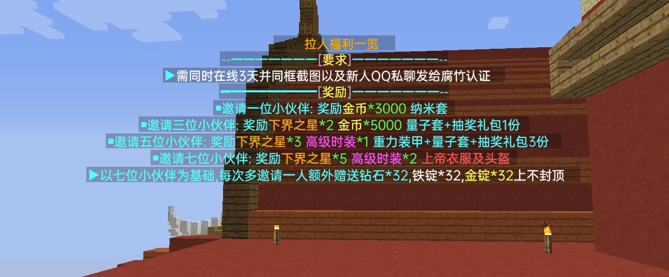 更惊喜的是,我们还拥有完善的经济系统,让你富甲一方不是梦!通行证系统,奖励拿到手软!商店系统,琳琅满目的商品等你来淘!最最最重要的是,进服就送任选时装!让你成为《我的世界》里最靓的崽!