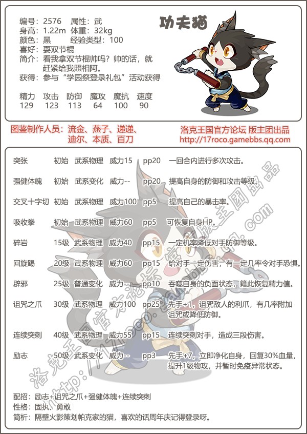 功夫猫,腾讯游戏《洛克王国》中的宠物。看我拿双节棍帅吗?帅的话,就赶紧给我照相阿。