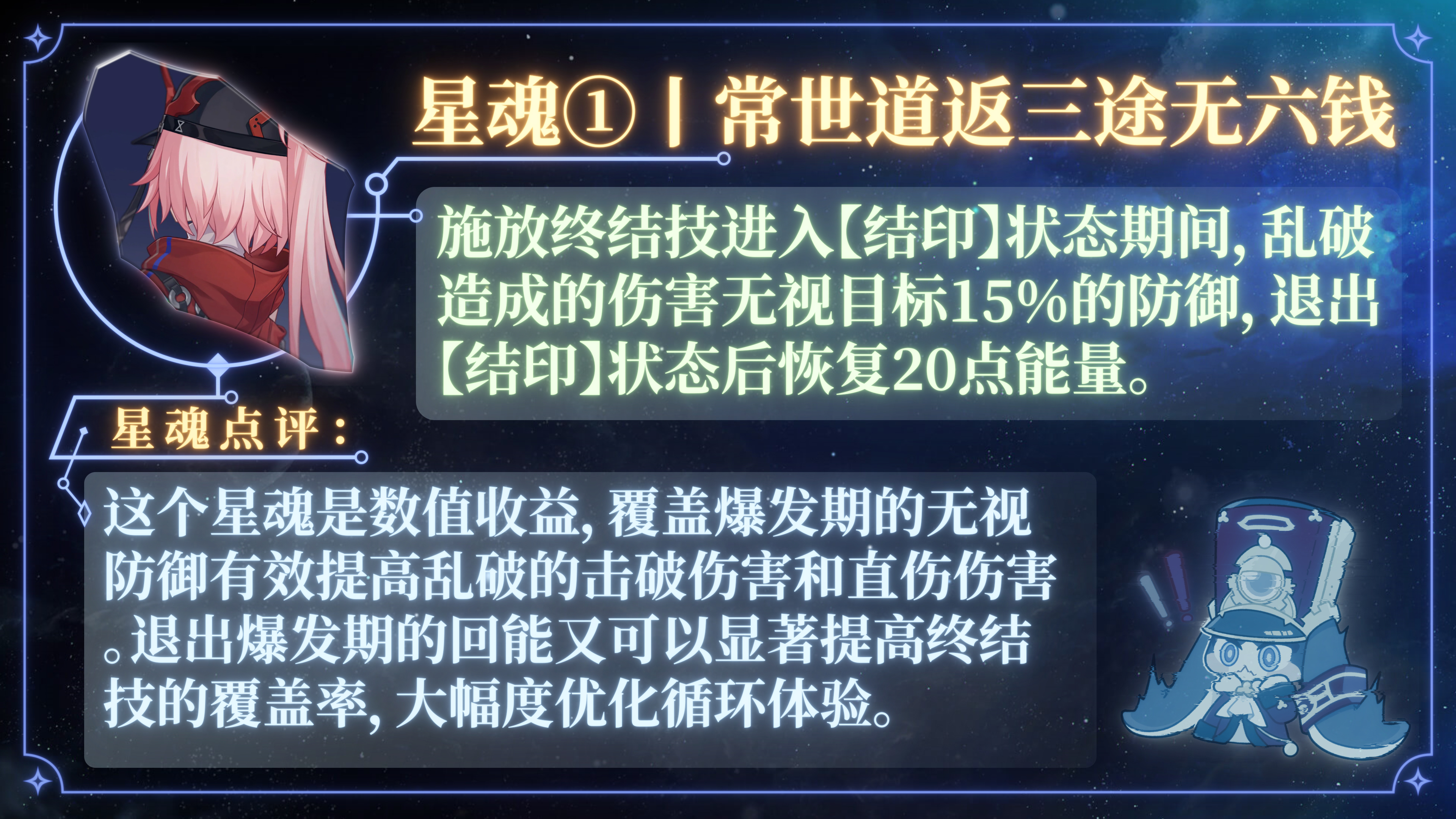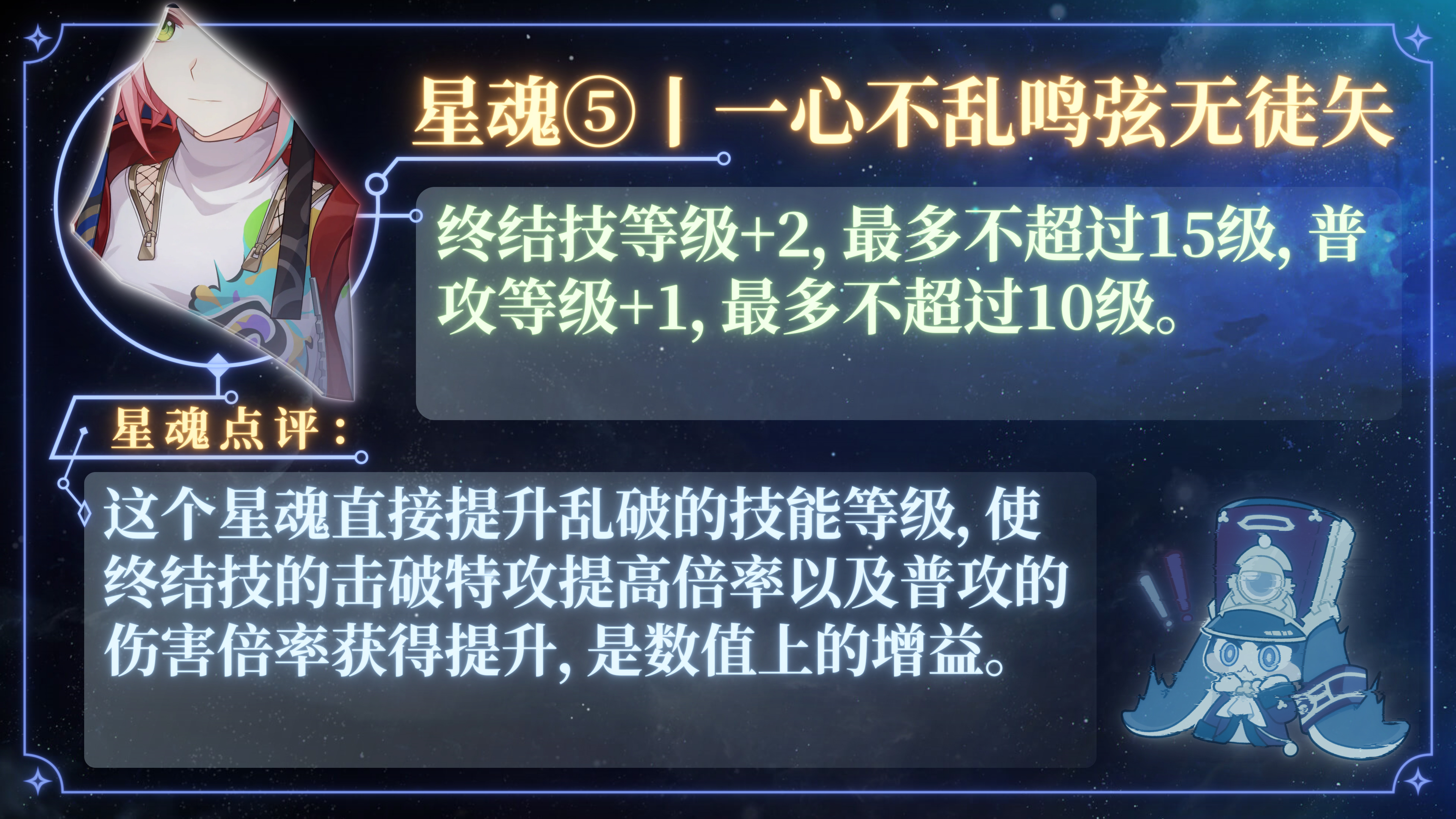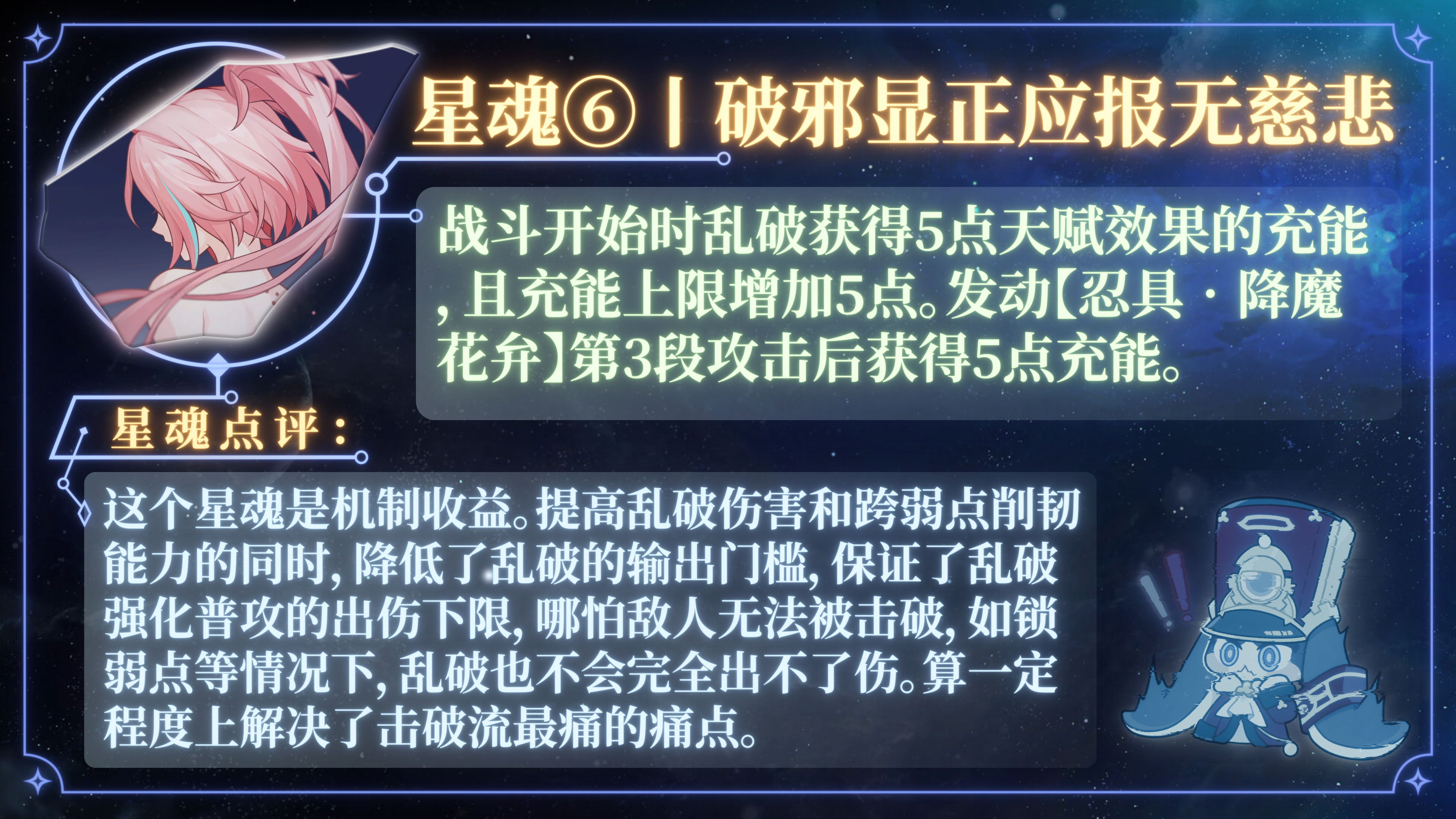 这个星魂是数值收益,覆盖爆发期的无视防御有效提高乱破的击破伤害和直伤伤害。退出爆发期的回能又可以显著提高终结技的覆盖率,大幅度优化循环体验。