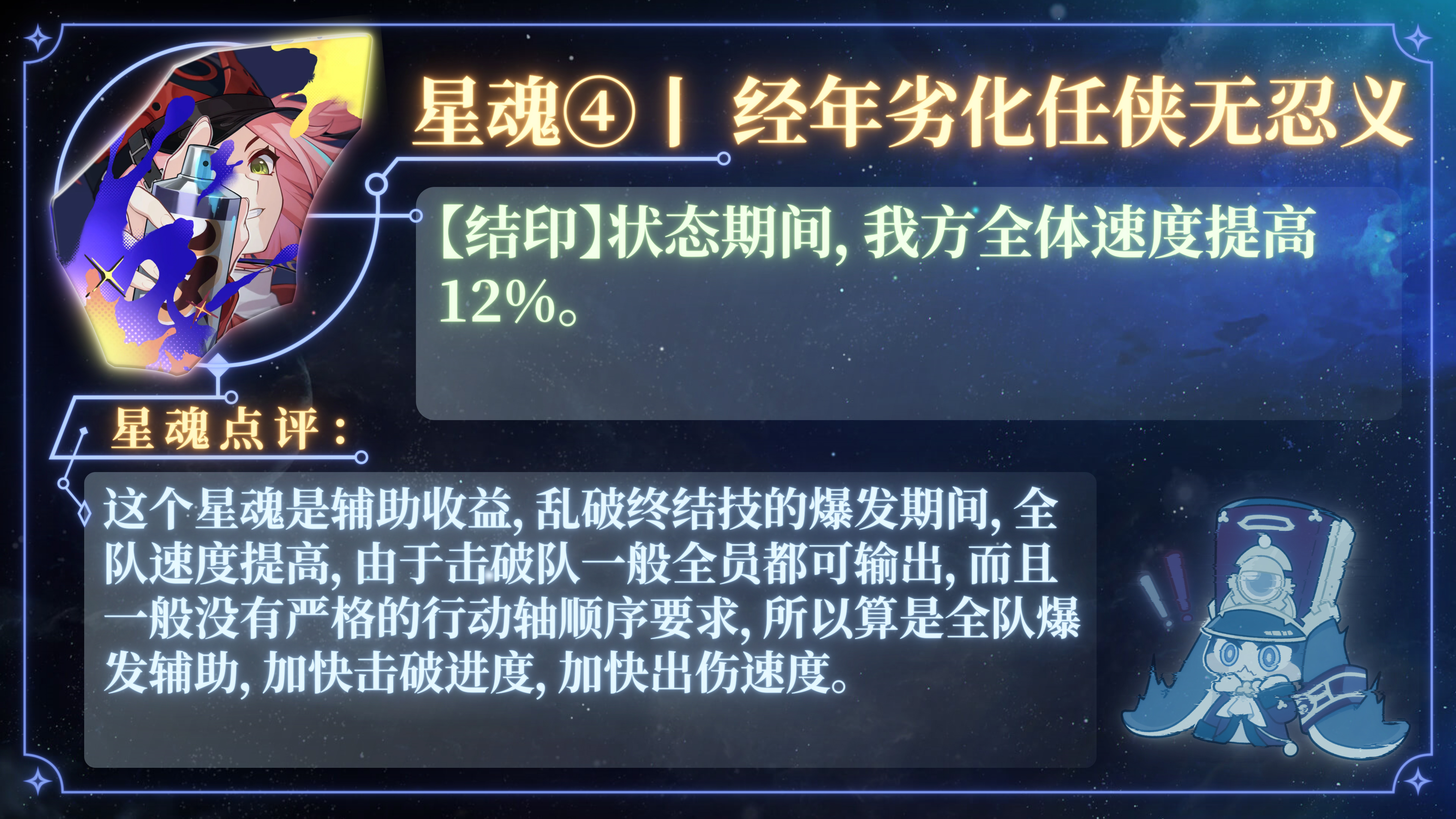 这个星魂是辅助收益,乱破终结技的爆发期间,全队速度提高,由于击破队一般全员都可输出,而且一般没有严格的行动轴顺序要求,所以算是全队爆发辅助,加快击破进度,加快出伤速度。