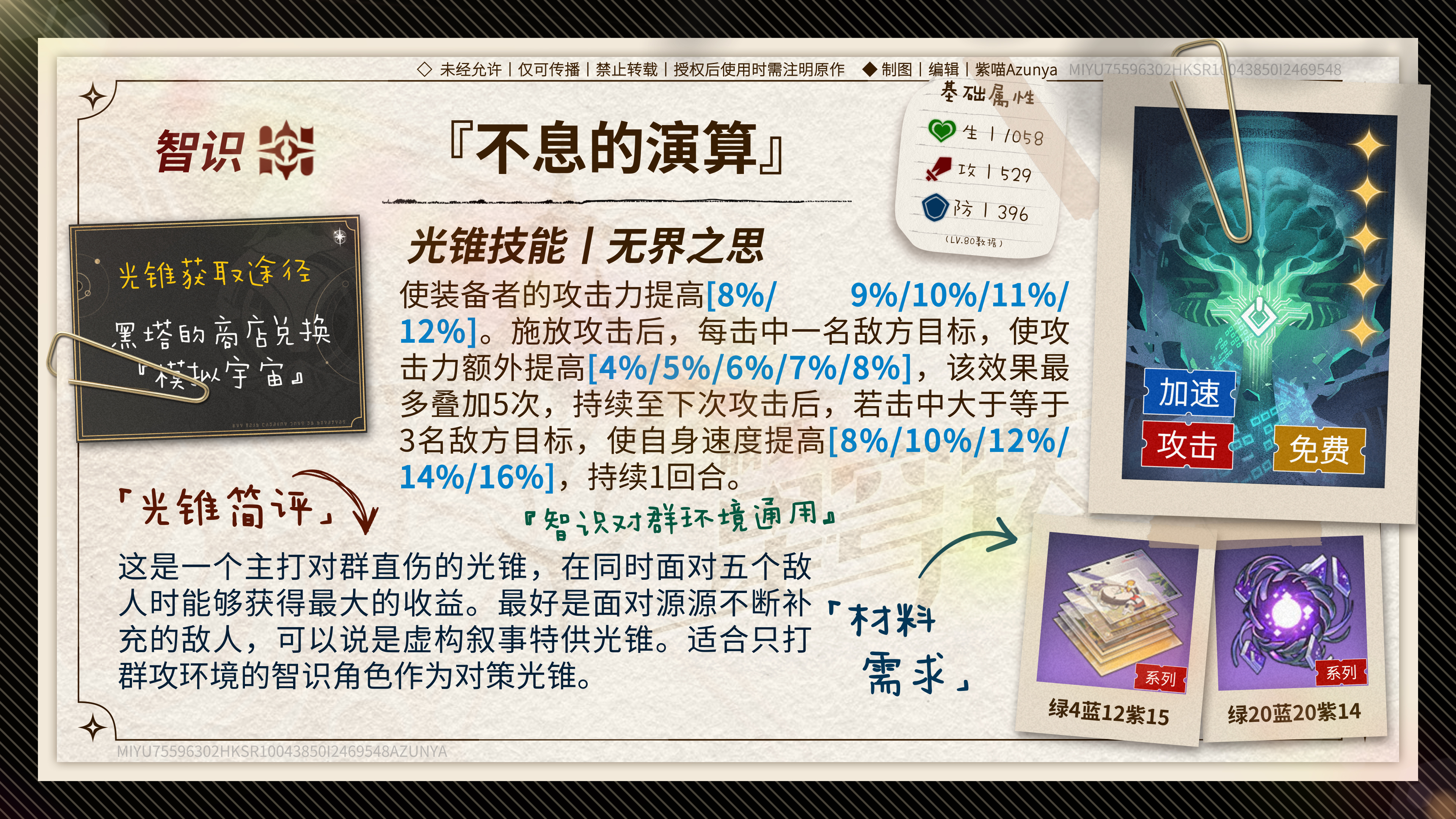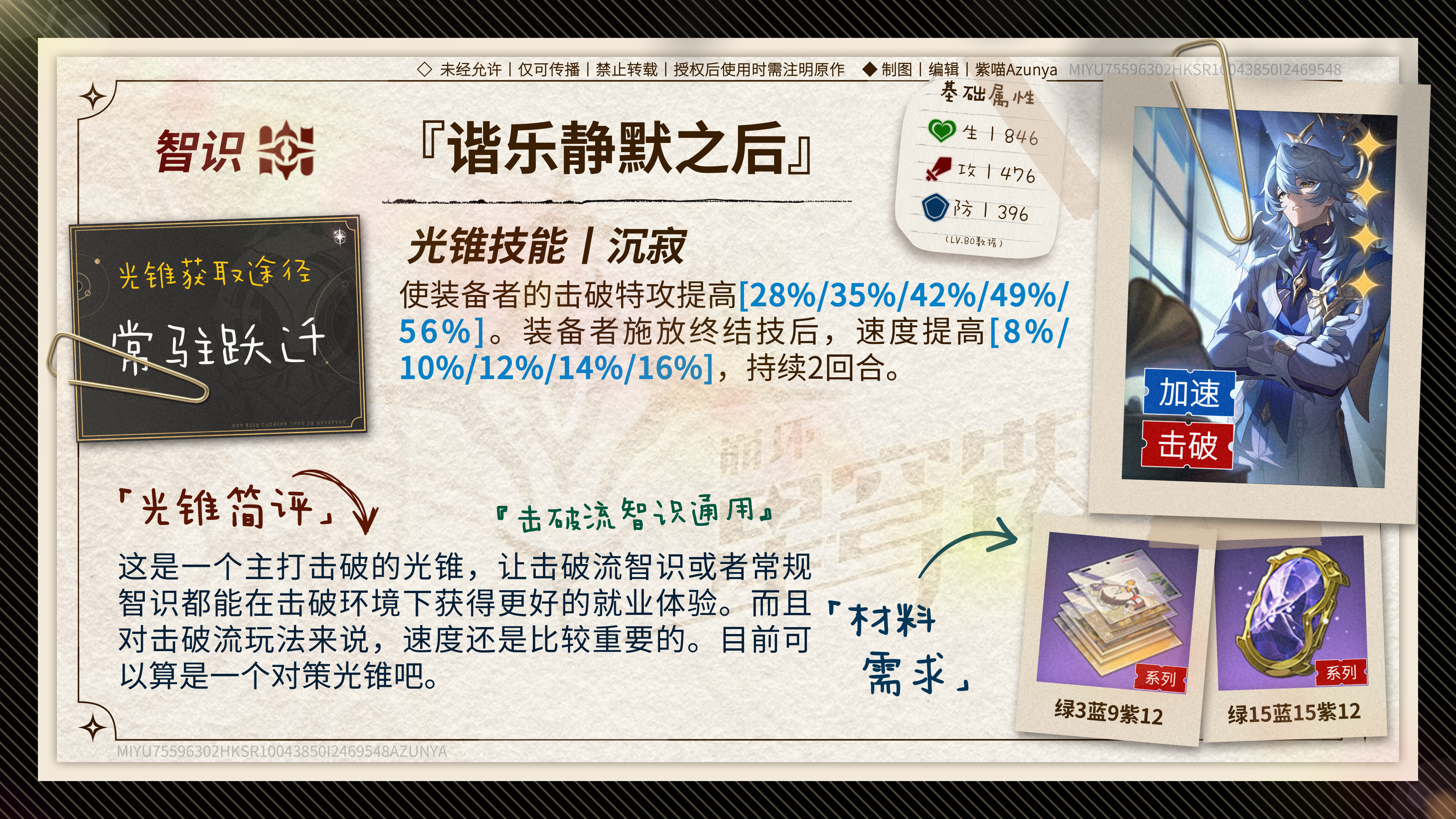 这是目前击破流智识的唯一四星光锥,满叠影时提供接近1叠专武的击破特攻,此外还有施放终结技后加速的效果,持续时间2回合是可以覆盖乱破的爆发期的,一定程度上能加快爆发期的出伤速度,抢在敌人恢复韧性之前把爆发打完。