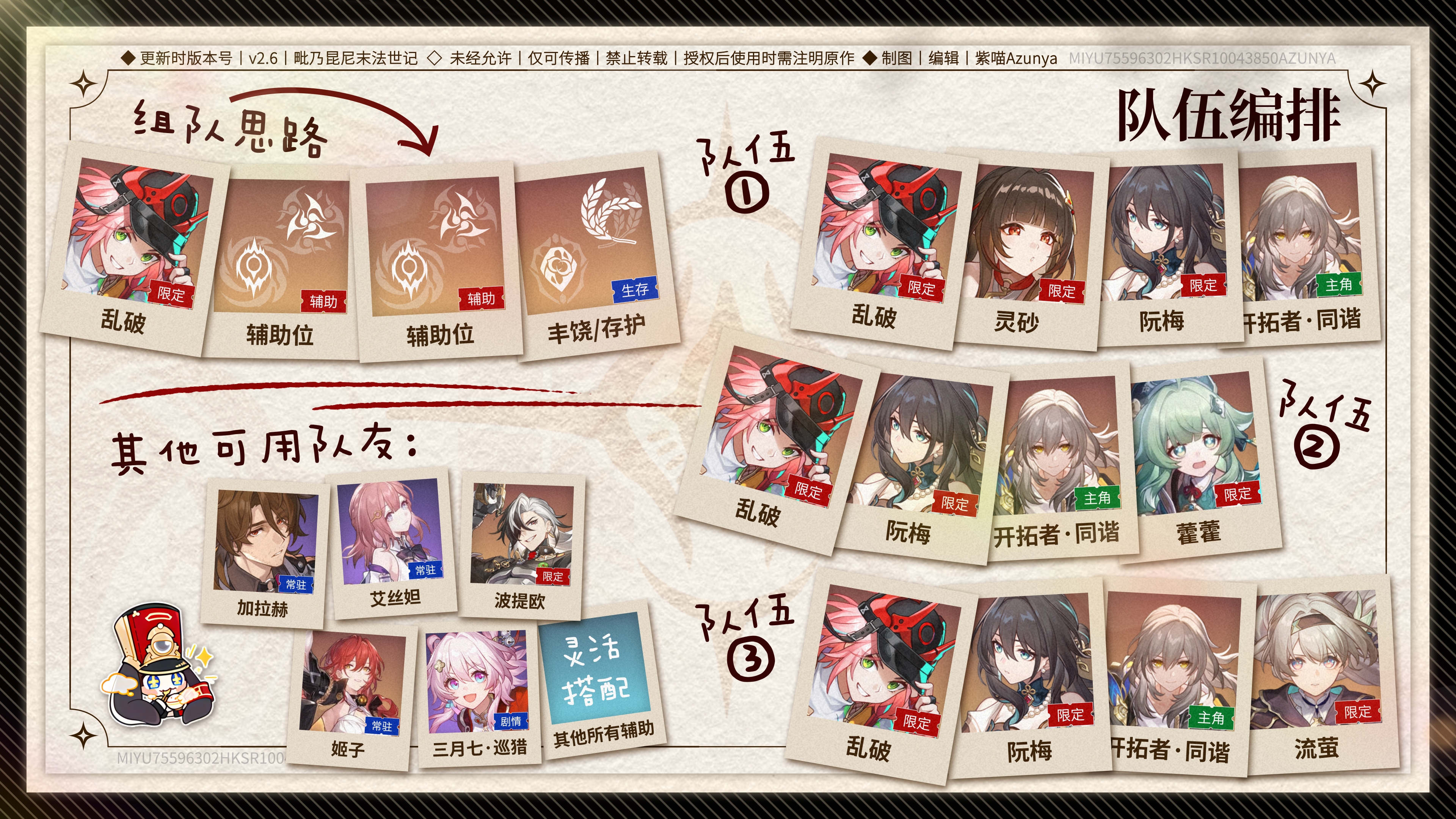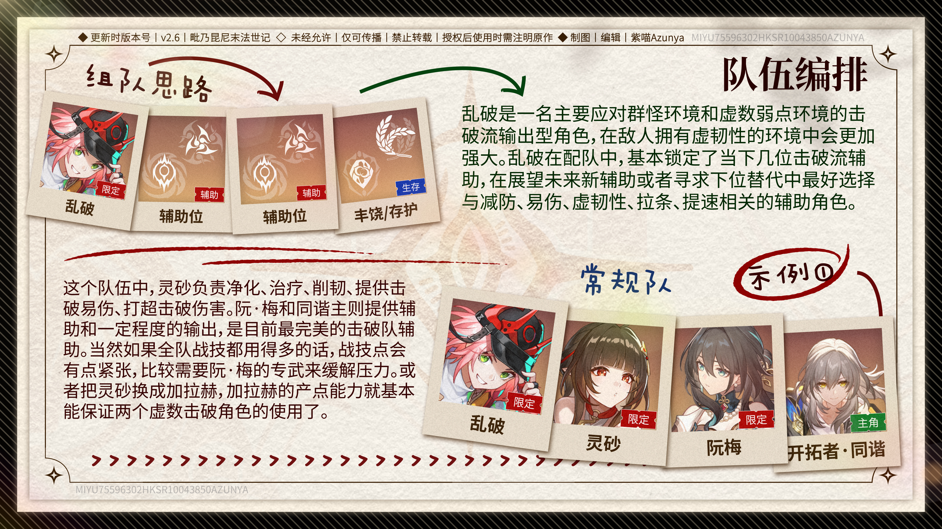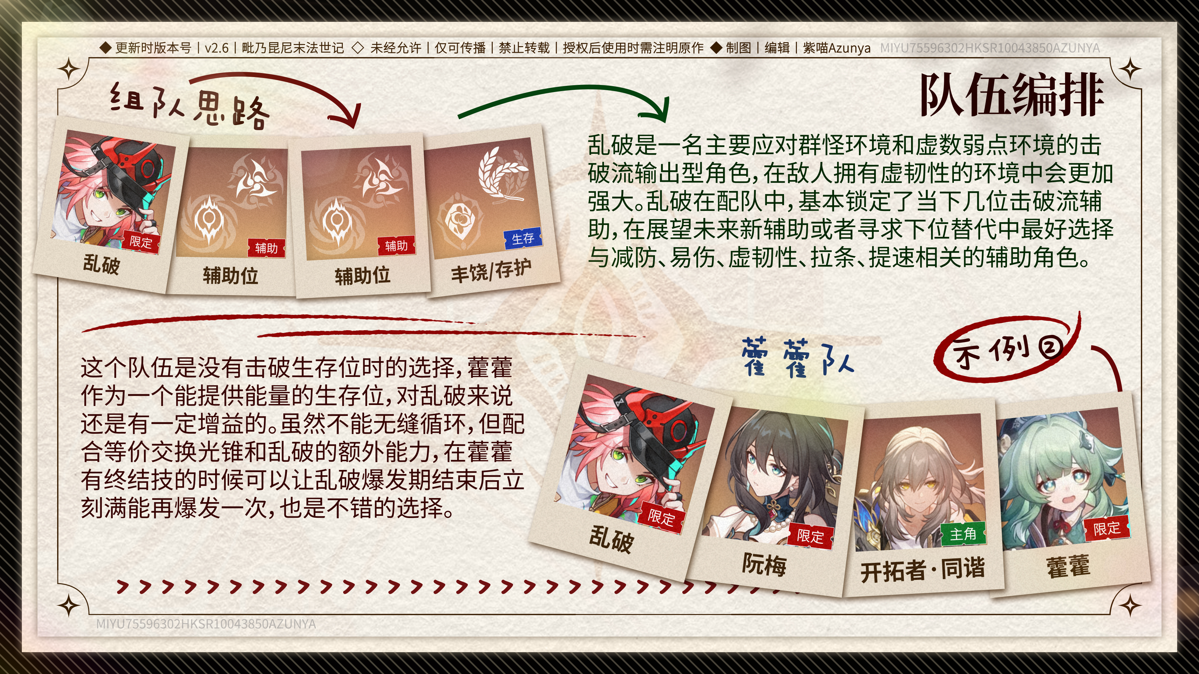 这个队伍是比较小众的双击破流派,属于流萤击破队的变种,舍弃了生存位,替换成乱破。打群怪和虚数弱的环境时会比较好玩,但如果敌人没有虚数弱点,那么乱破在这个队伍中是不如灵砂的。