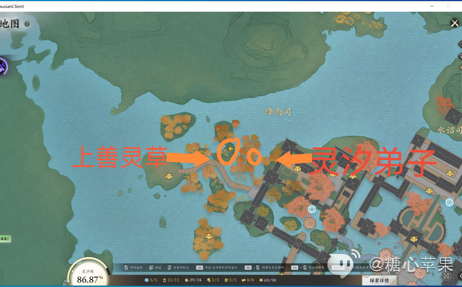 按地图方式找到灵草和灵汐弟子以及小兔子的位置
