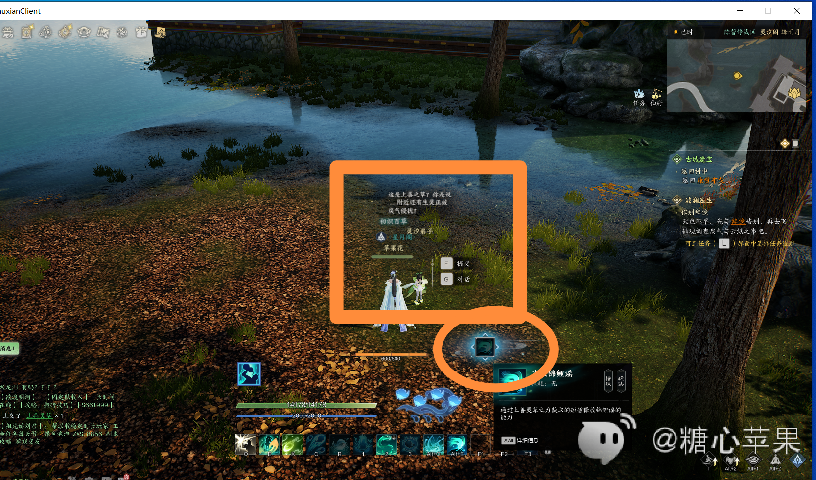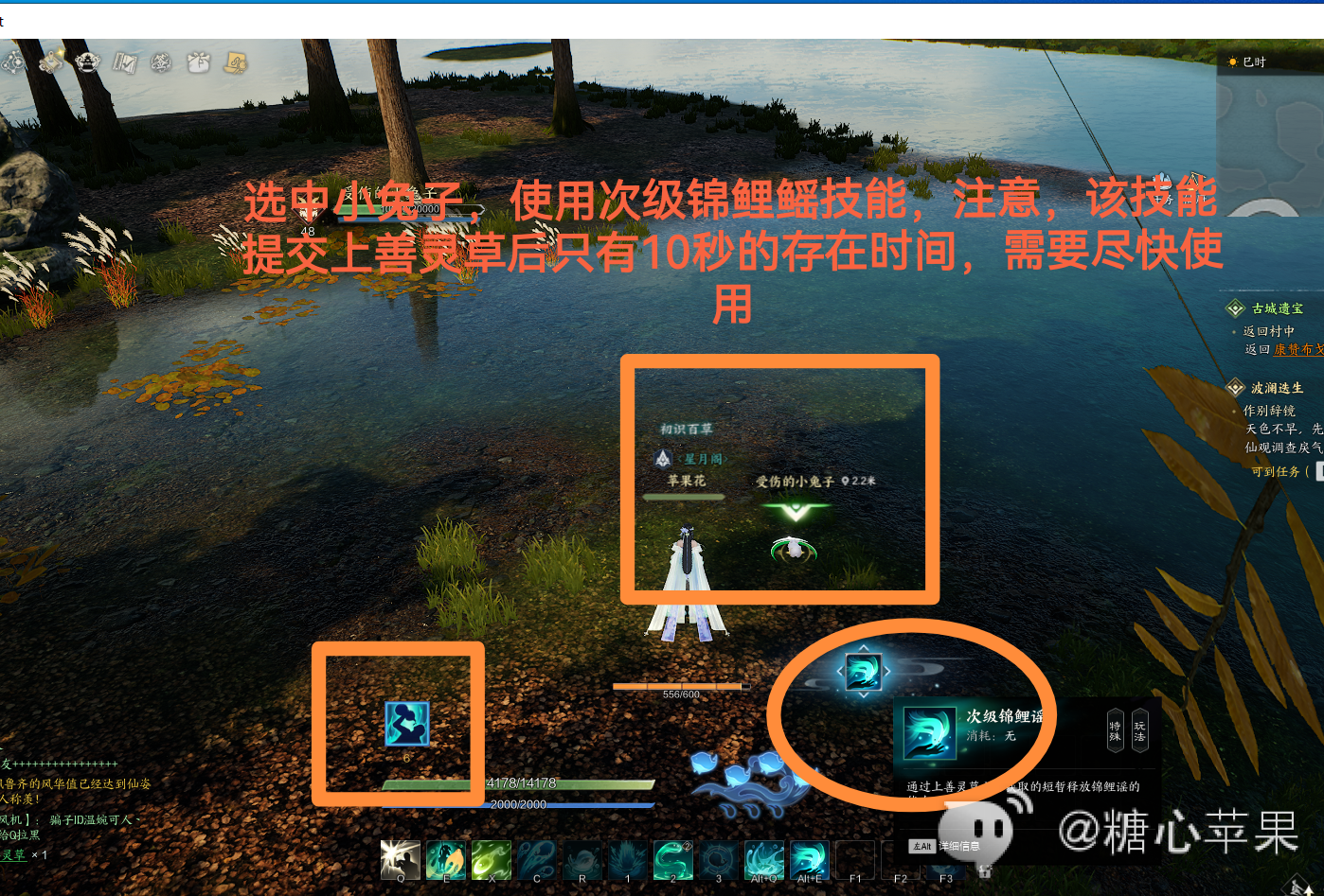 第一步采集上善灵草,然后交给序号二的灵汐阁弟子,提交后在辅助技能栏里会出现一个“次级锦鲤鳐”的技能,存在时间10秒,尽快选中序号三的兔子,释放技能动作快可以一次奶满血,如果一次不能奶满,那就再重复以上顺序来一次