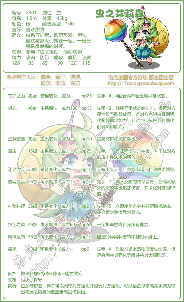 简析:虫系守护者,捧杀可以剥夺对方强化并虚弱对方强化,可以配合拟态高先手威力输出和迷之微笑的低血量高固伤输出。