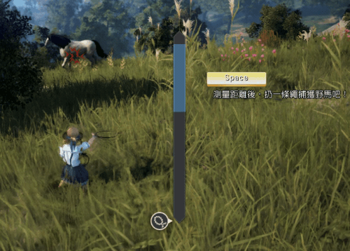 第二阶段,成功套住野马后,拉着绳子的情况下按W接近马。