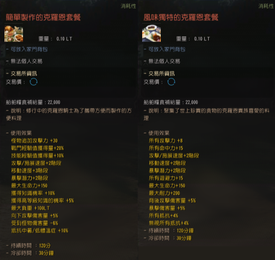 其中「简单制作的克罗恩套餐」、「风味独特的克罗恩套餐」增加的能力值与持续时间都相当优质,在打怪跟PVP都相当受欢迎!