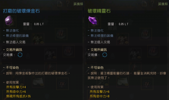 炼金石和精灵石是使用在装备视窗(快捷键:l)正中央栏位的道具。