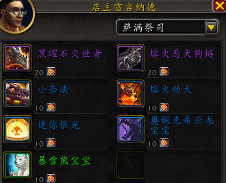 从过去周年庆活动回归的坐骑和宠物购买需要90个代币,如果玩家没有雷吉纳德店主提供的如 [黑曜石灭世者]、[熔火恶犬狗链] 等一系列坐骑和宠物的话。其中2个坐骑每个20个代币,共40个;5个战斗宠物每个10个代币,总计50个。