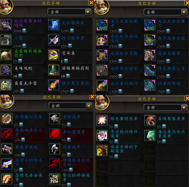 购买波巴多姆所有新的且昂贵的外观奖励就需要33100个徽章,这里面包括了 [乱羽角鹰兽的缰绳] 坐骑,[克拉格勒斯] 和 [小雾] 小宠物,还有 [练习破坏者] 玩具以及诸多如 [日哀嚎收割者]、[末日死神的镰刀] 等幻化外观,以及各种声望奖章。